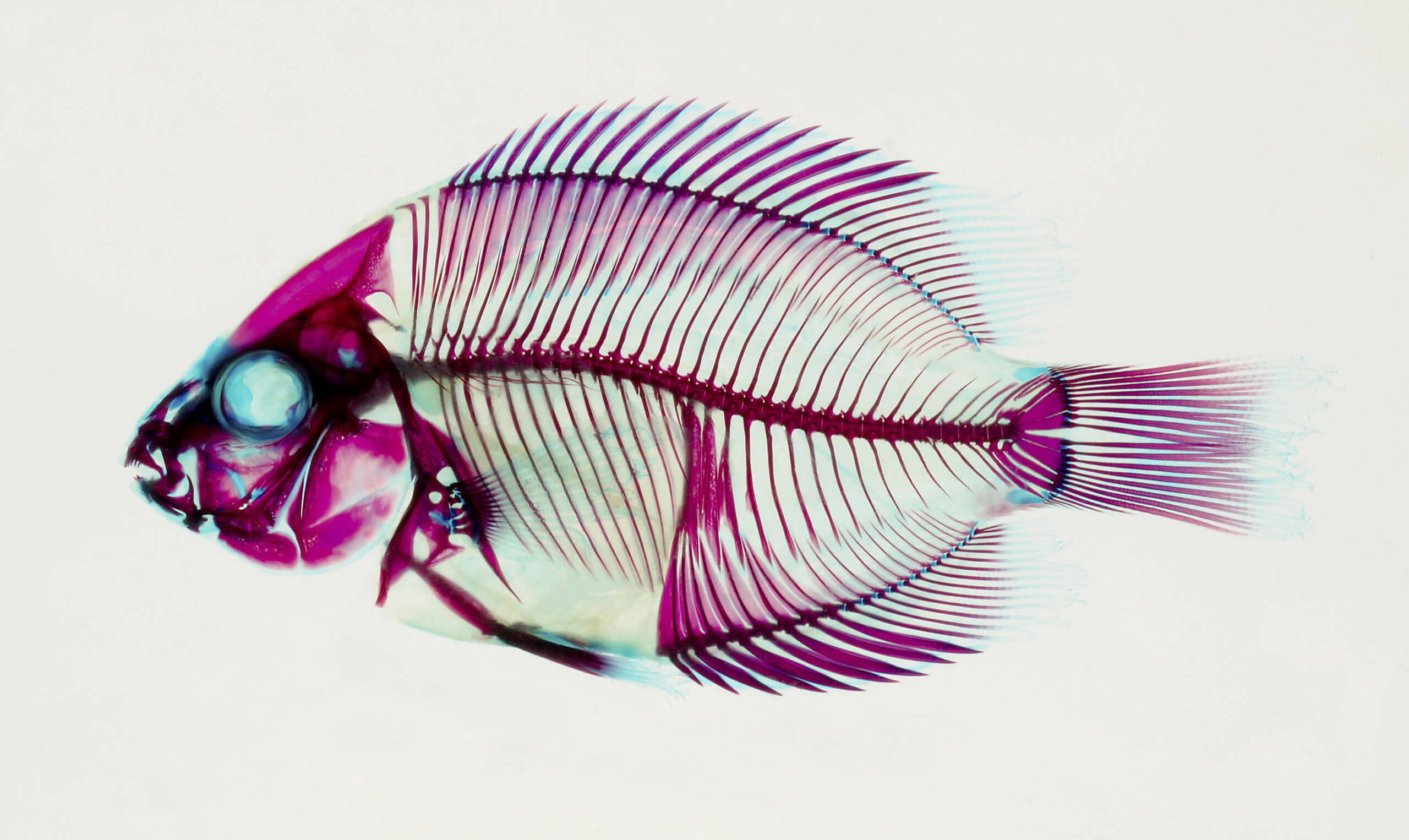 Ichthyologist John Sparks treated fish with a calibrated series of chemical dyes. Red dye tints bones, blue dye clings to cartilage, and enzymes “clear” tissues, rendering them transparent. These and other stunning images are featured in The Bishop’s newest exhibition Picturing Science: Museum Scientists and Imaging Technologies opening to the public March 5. Image by John S. Sparks, Associate Curator, Division of Vertebrate Zoology American Museum of Natural History.
