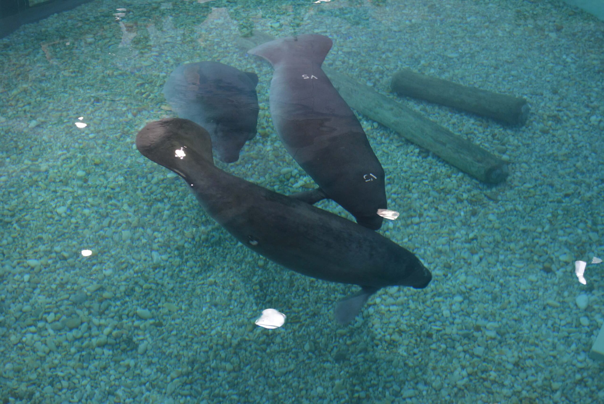 This topside image shows ONeil in the foreground with Tannebaum. The marking on his back is a freezebrand, which will help rescuers monitor his progress when he eventually returns to the wild. He was rescued at a very young age and was smaller than typical manatee newborns, so keeping track of his return to the wild will be very important. Photo copyright South Florida Museum.